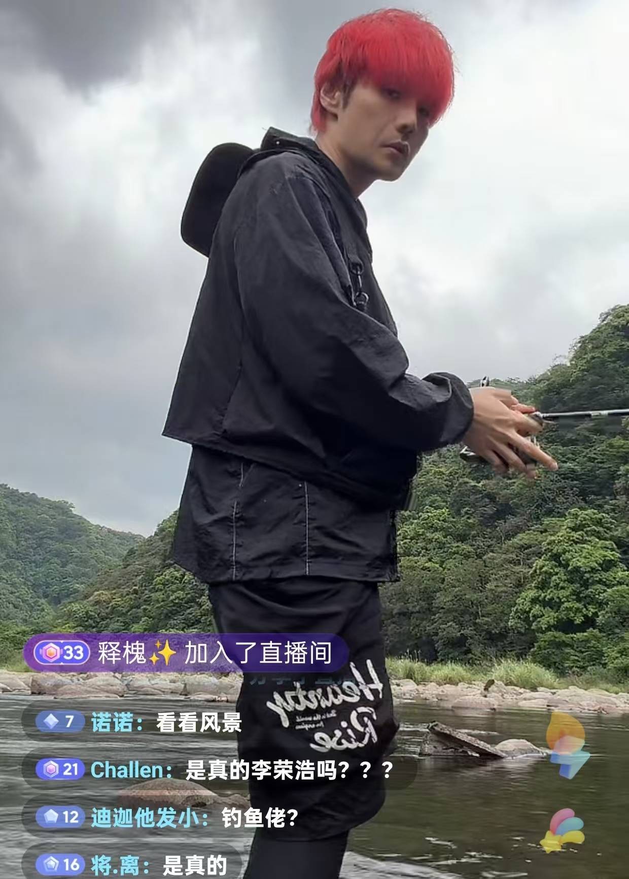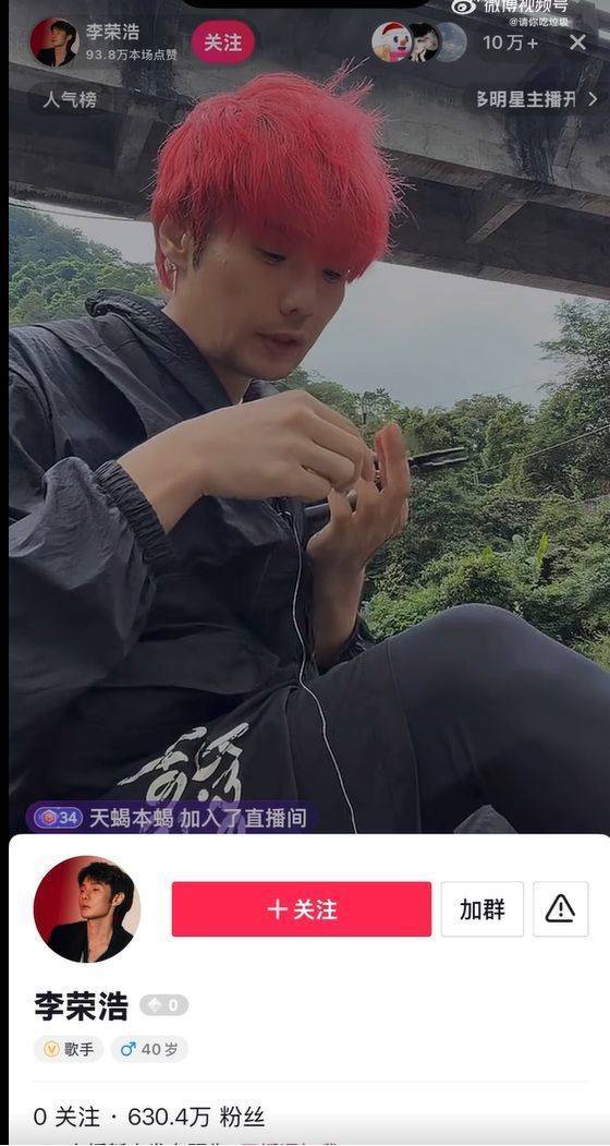 素颜出镜的李荣浩顶着红发、戴着渔夫帽,与舞台形象反差巨大,甚至被误认为高仿账号。他透露开播仓促未带专业支架,只能现场找石头固定,这一细节为意外埋下伏笔,也让网友直呼“太真实,像极了野钓翻车的自己”。